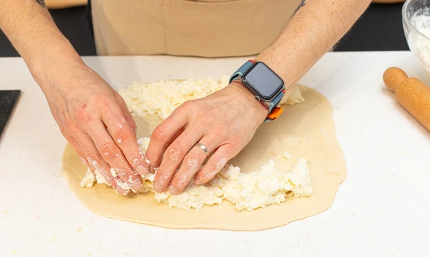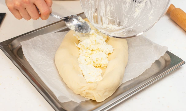 По краям длинных сторон пласта выложите по ⅓ начинки.