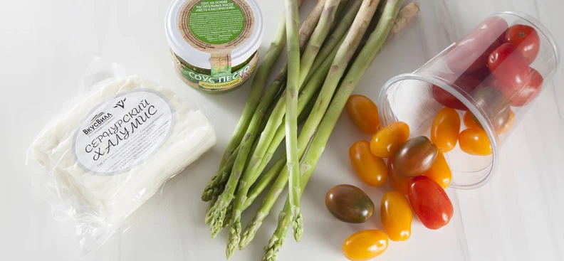 Халумис обжарьте на сухой сковороде до золотистой корочки. Горячий сыр выложите на тарелку, сверху стебли спаржи и соус песто, подавайте со свежими помидорами и теплым хлебом.