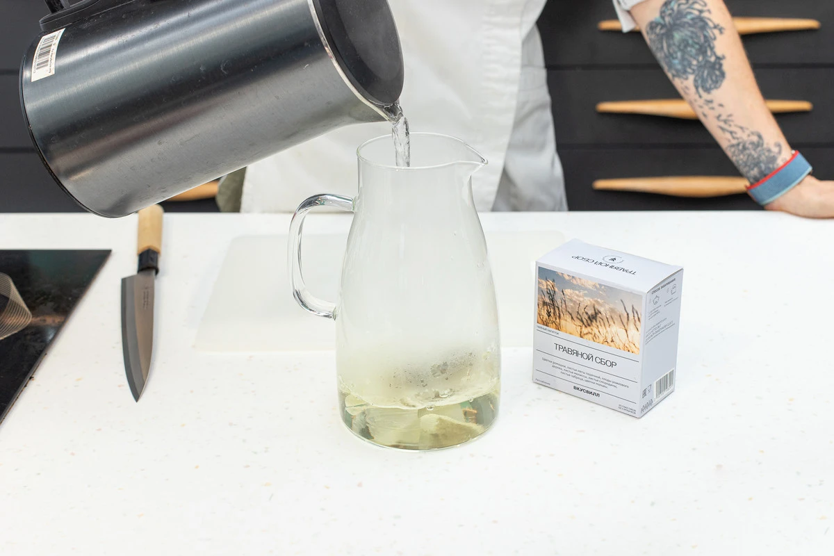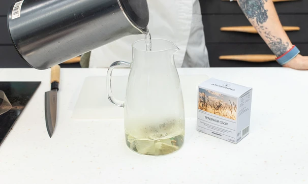 Положите в термостойкий кувшин 2 пакетика травяного сбора и залейте кипятком.
