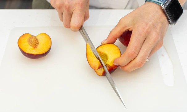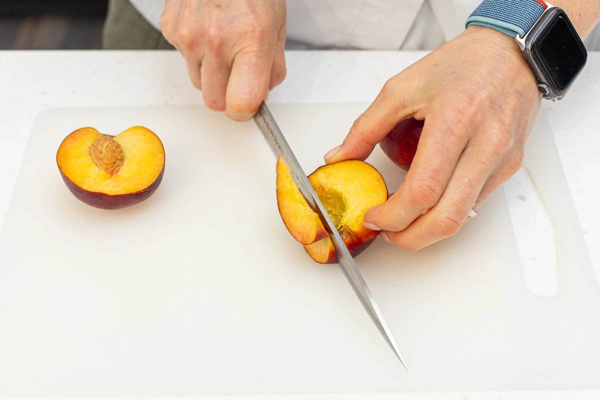 У персиков удалите косточки и нарежьте мякоть дольками или кубиками.