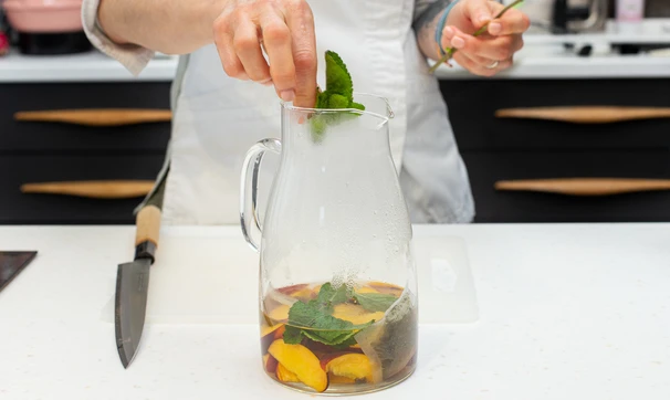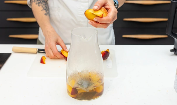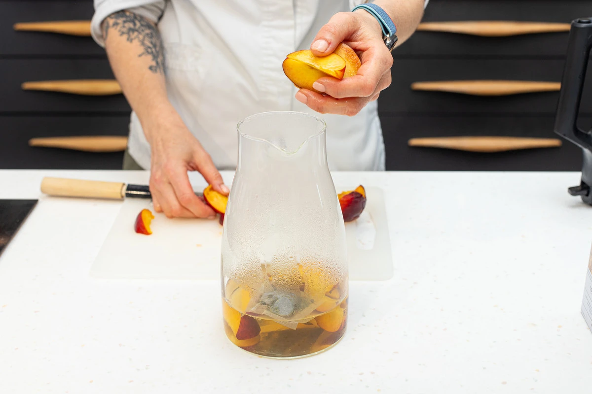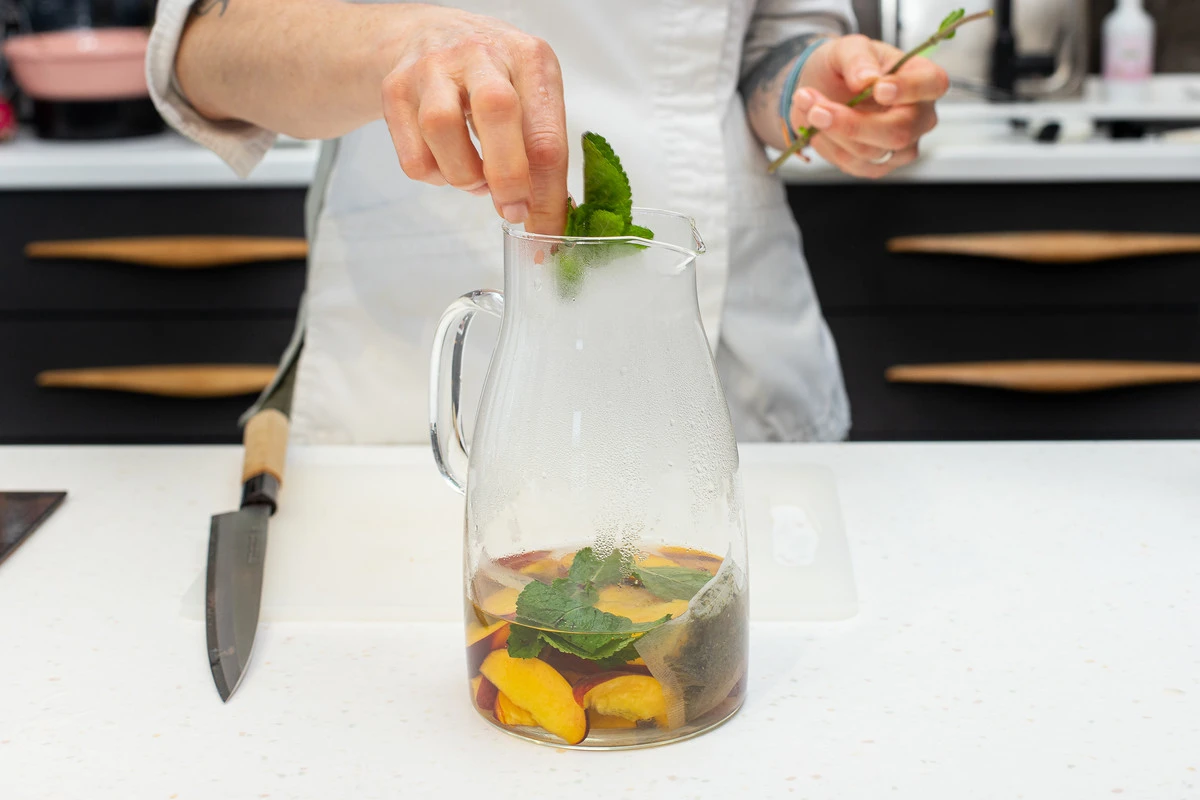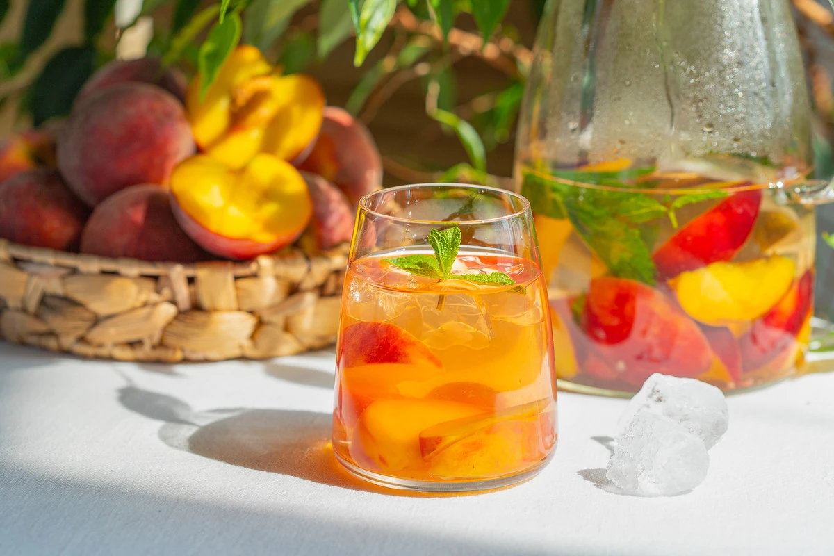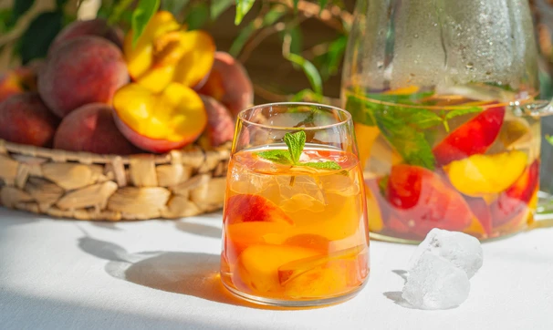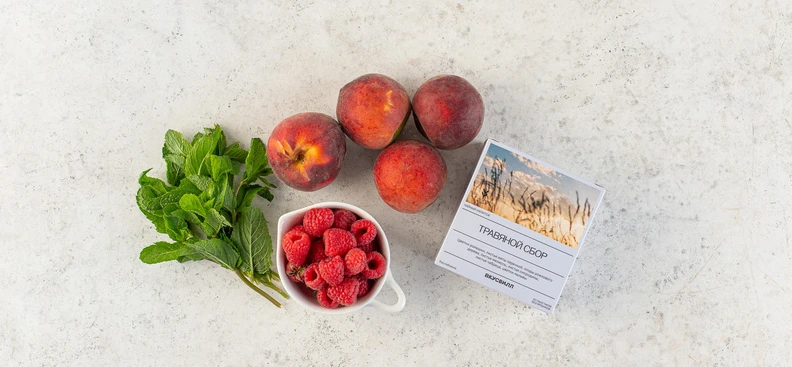 Пополните коллекцию рецептов холодного чая этим напитком с персиками и малиной. Вы можете приготовить его и на основе чёрного чая, но мы решили использовать травяной сбор — так напиток получится и ароматнее, и более освежающим. Идеально для жары!