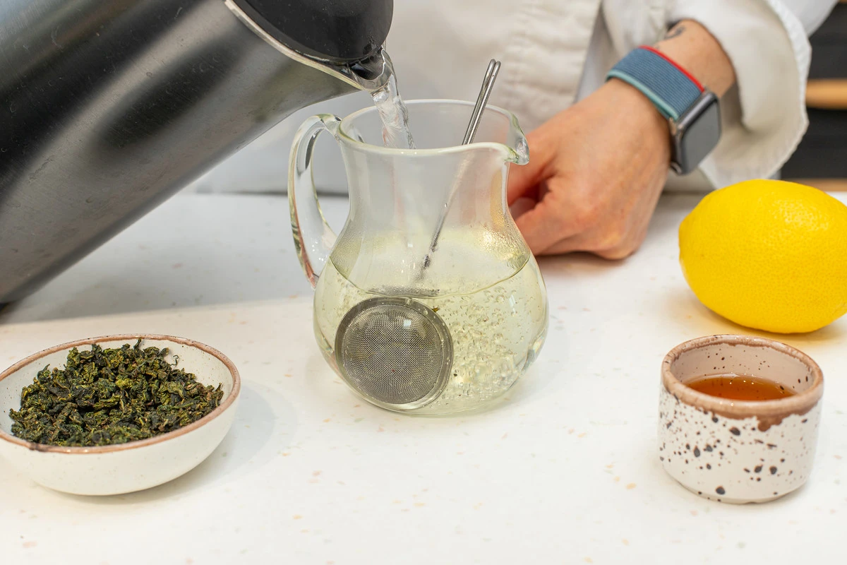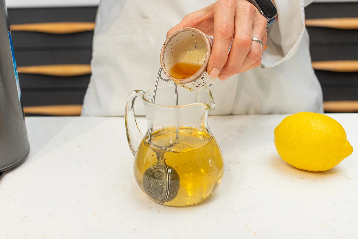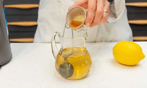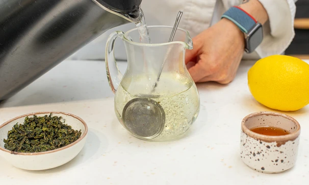 Положите чай в ситечко. Залейте термостойкий кувшин кипятком и опустите в него ситечко. Поболтайте ситечком в воде, чтобы чай быстрее заварился.