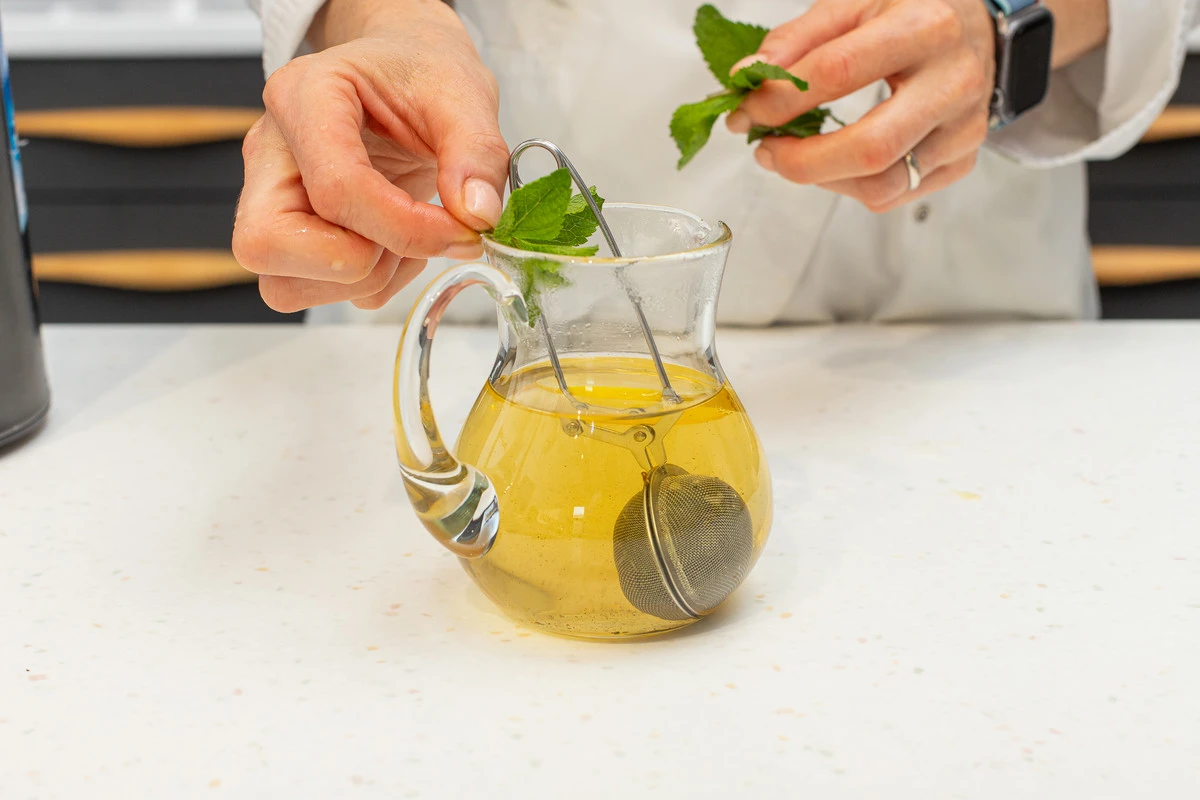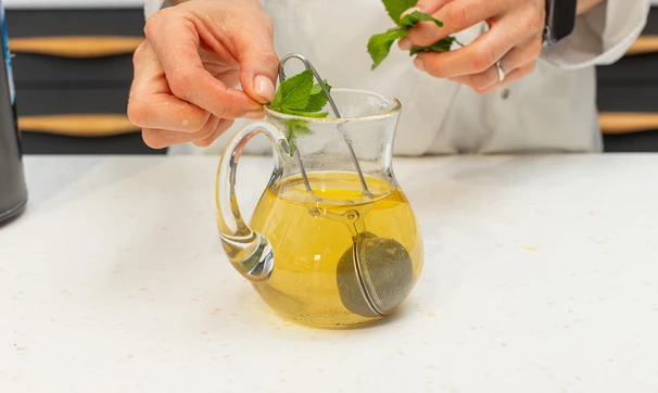 Положите листики нескольких веточек мяты или по вкусу. Оставьте минут на 5-10, чтобы напиток настоялся.