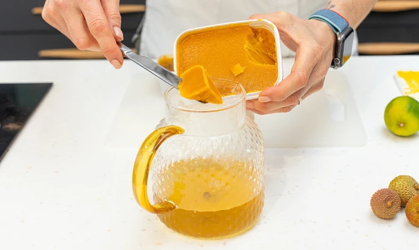 Добавьте пюре манго, можно предварительно не размораживать — оно быстро разморозится в кипятке.