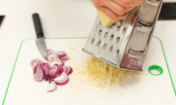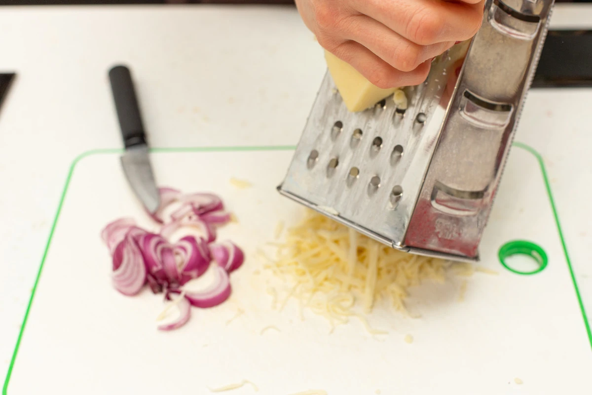 Лук нарежьте тонкими перьями. Сыр измельчите на тёрке.