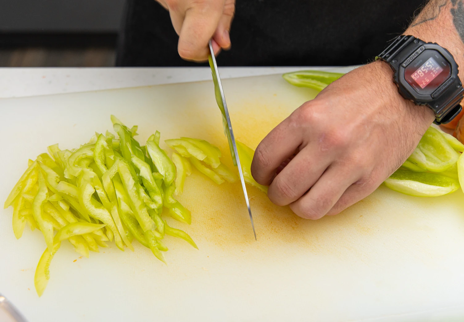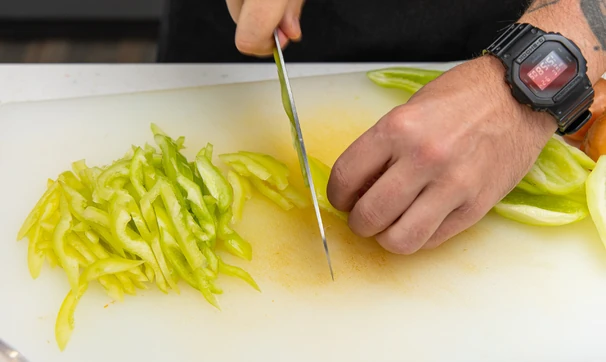 У болгарского перца удалите семена и плодоножки, затем нарежьте все овощи произвольными кусочками.