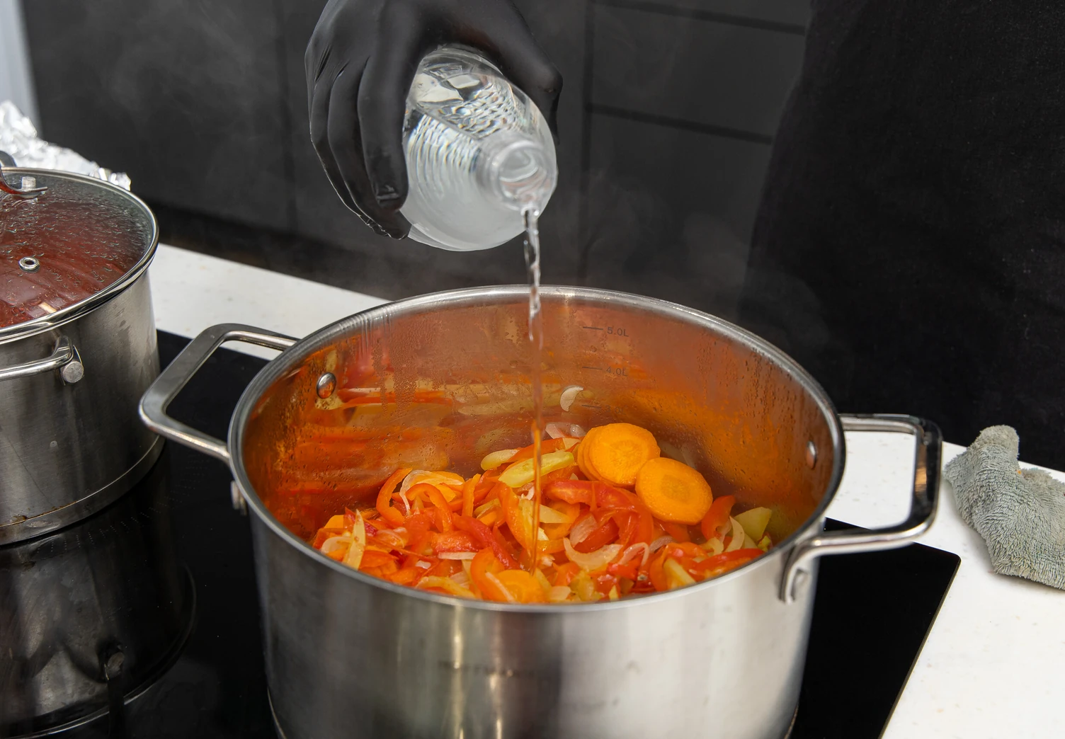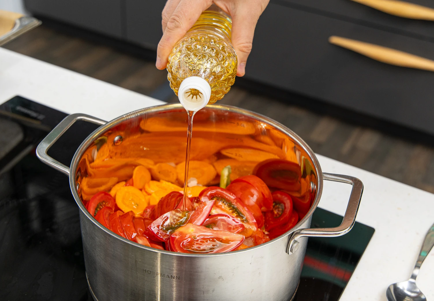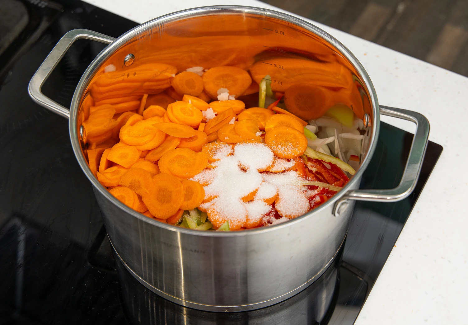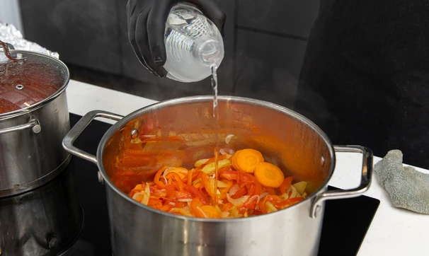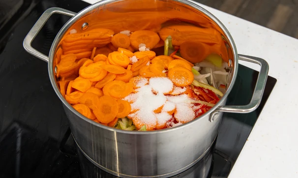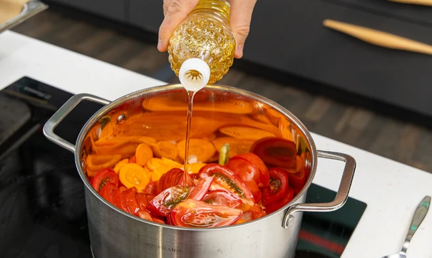 Сложите нарезанные овощи в кастрюлю с толстым дном.