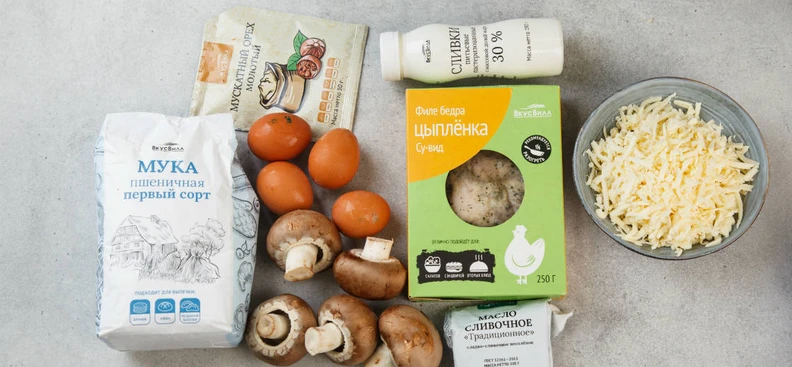Для начинки нарежьте шампиньоны и куриное мясо ломтиками. Сливки смешайте с яйцами и мускатным орехом, посолите.