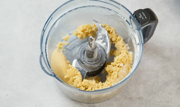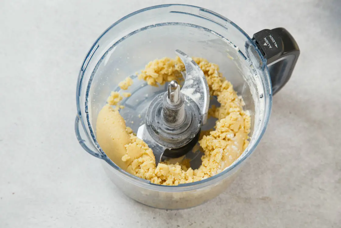 Холодное масло (из холодильника) пробейте в блендере с мукой и солью до крупной крошки. Затем добавьте яйцо, включите блендер ещё буквально на пару секунд, чтобы тесто собралось в ком.