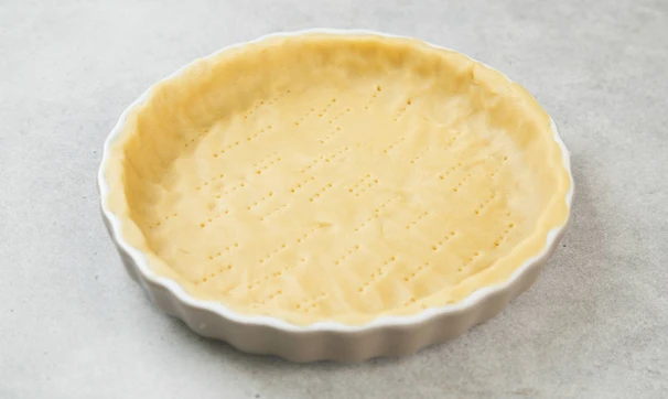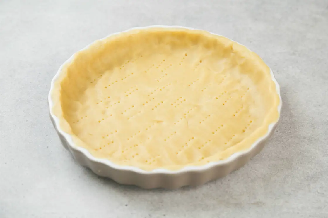 Распределите тесто по форме для выпечки, смазанной маслом, сделайте частые наколы вилкой. Традиционно киши пекут в круглой форме, но можно использовать любую. В этом рецепте форма диаметром 30 см. Уберите тесто в холодильник на 15-20 минут, тем временем разогрейте духовку до 180°С и приготовьте начинку.