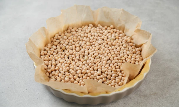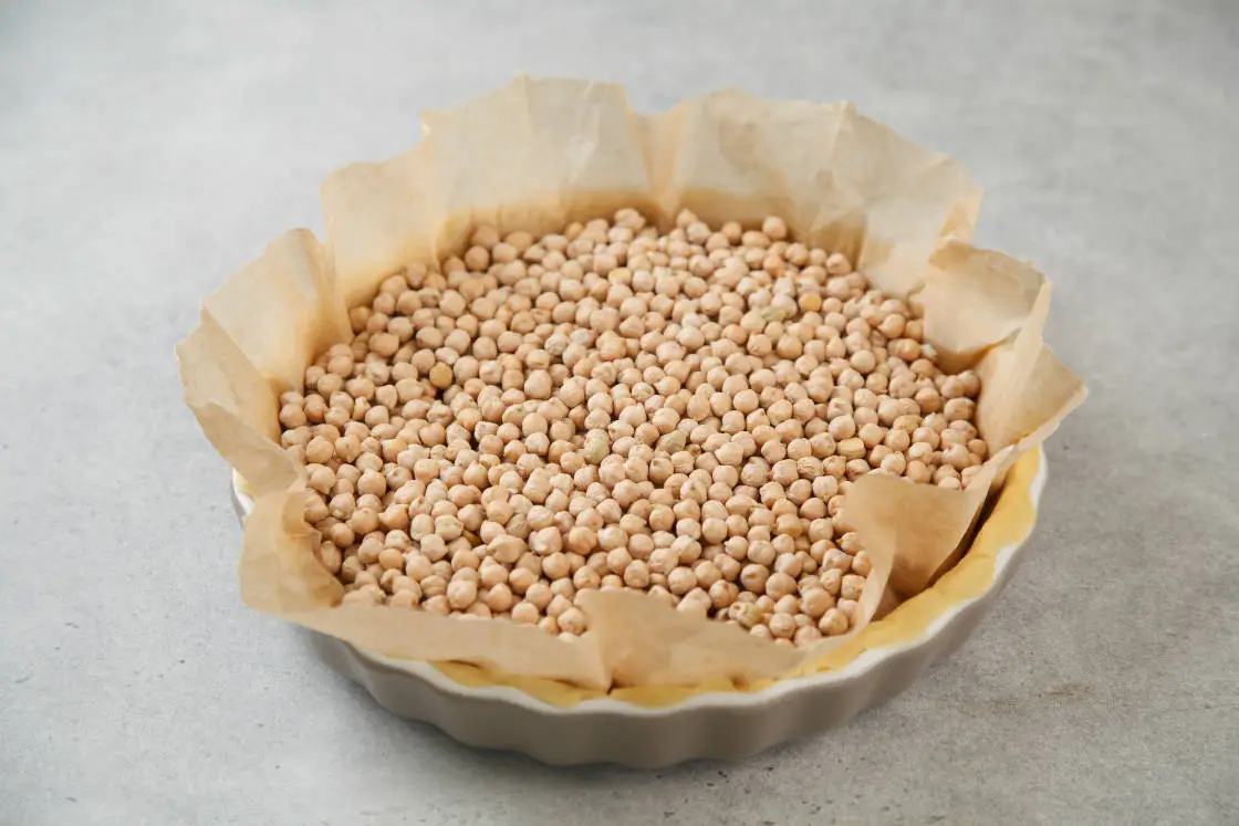 Выньте форму с тестом из холодильника, сверху положите пергамент и насыпьте груз. В качестве груза используют керамические шарики, но их легко заменить обычным горохом или фасолью, которые можно использовать многократно.