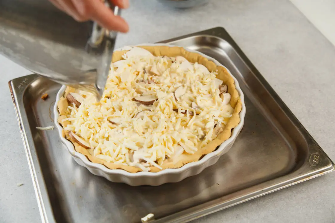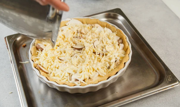 Выпекайте тесто с грузом примерно 15 минут, затем уберите пергамент и пеките ещё 10 минут. На горячее тесто выложите грибы и курицу, залейте сливочно-яичной смесью и посыпьте сыром, выпекайте ещё 20-25 минут.