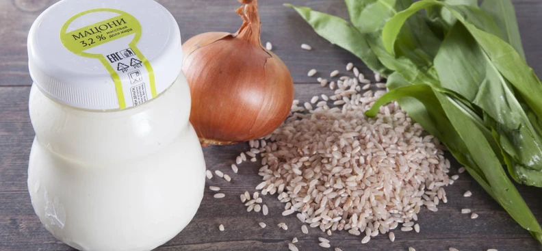 Мацони размешайте с 500 мл воды, посолите, получившуюся смесь вливайте понемногу в кастрюлю с луком, размешивая до однородности. Доведите до кипения, добавьте рис и черемшу, прогрейте еще пару минут на слабом огне. Если вместо черемши используете пряную зелень, добавьте ее перед подачей, прямо в тарелки. Приятного аппетита!