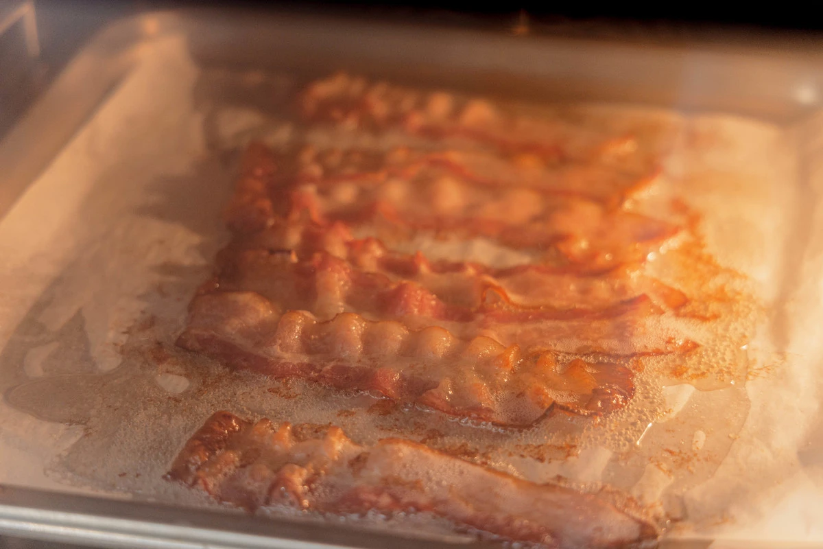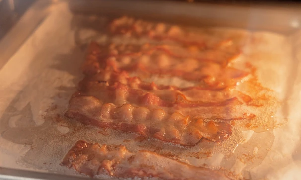 На противень, застеленный пергаментом, выложите полоски бекона. Запекайте при 200 °C около 6-8 минут.