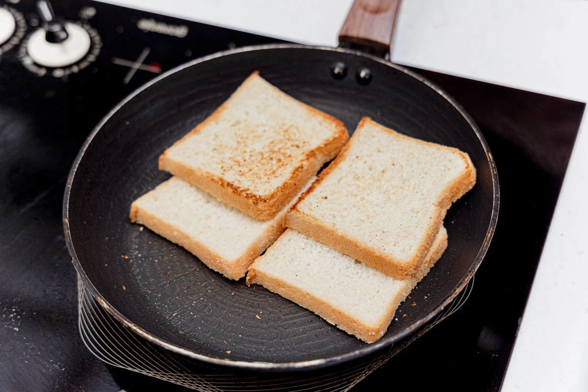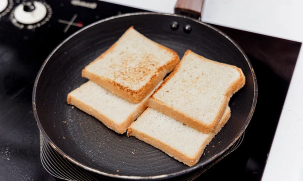 Куриное филе нарежьте ломтиками, томаты — кружочками. Хлеб слегка поджарьте в тостере.