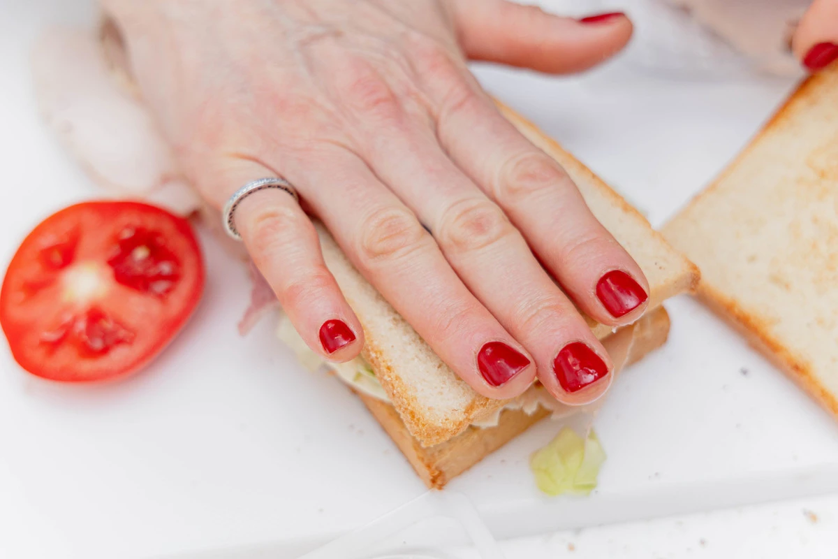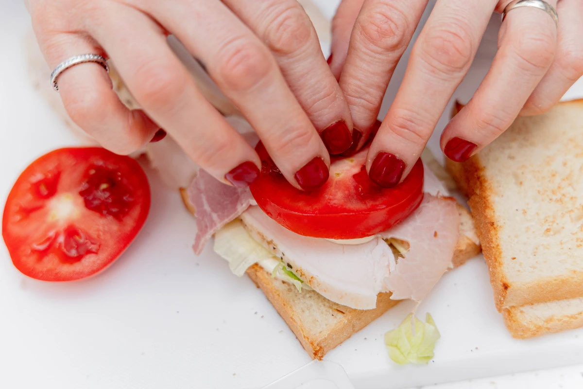 Собирайте сэндвичи в таком порядке: хлеб, майонез, куриное филе, помидор, хлеб, майонез, окорок, айсберг, сыр, бекон, помидор, майонез, хлеб.