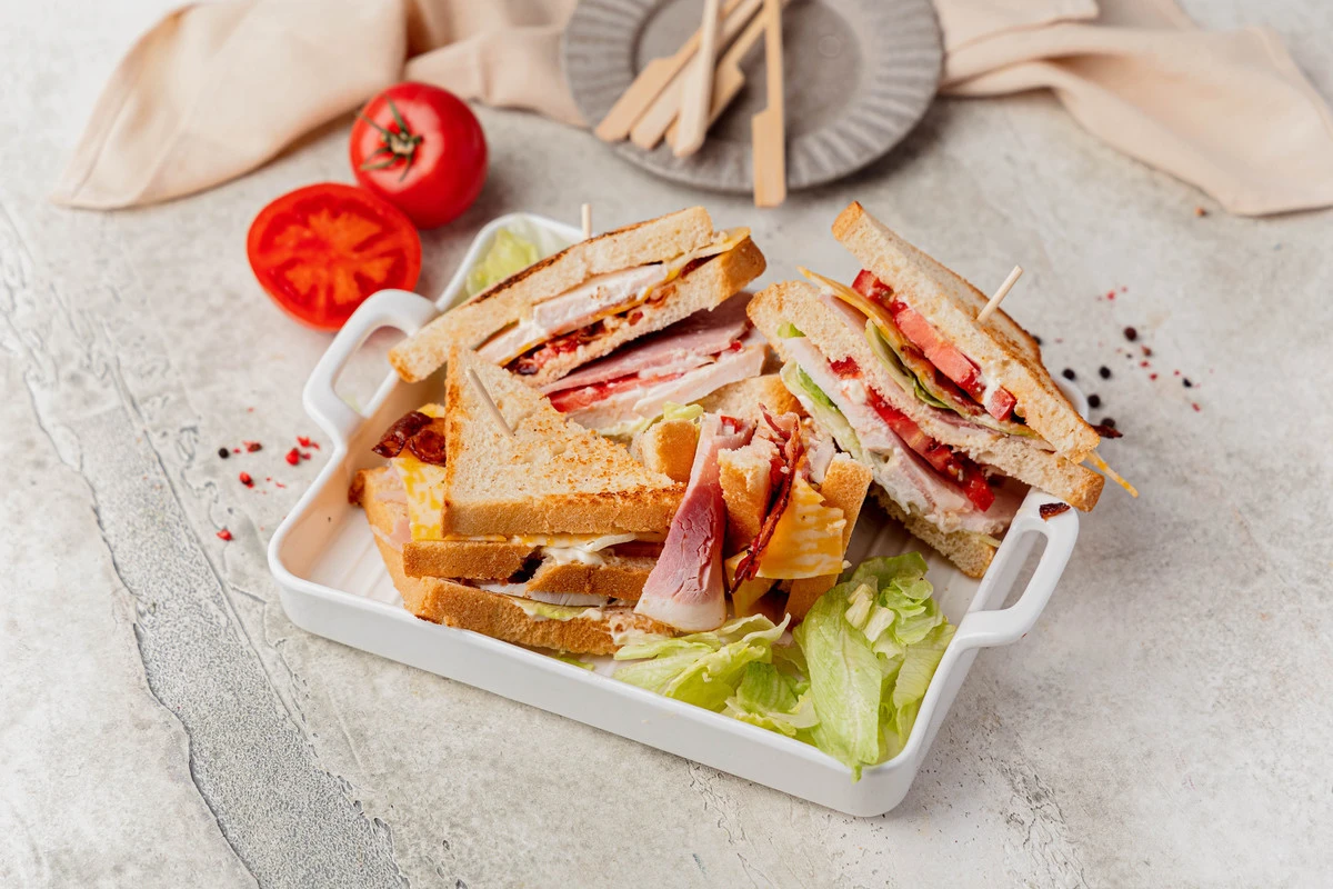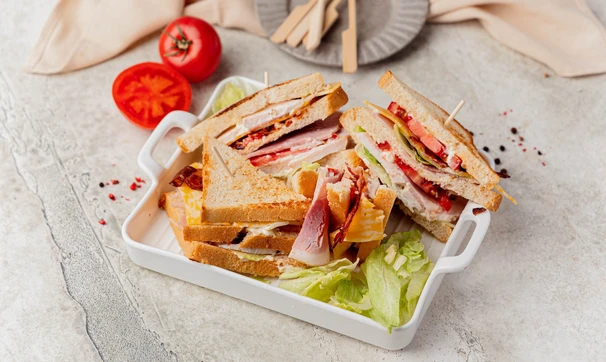 Можно скрепить слои шпажкой и подавать клаб-сэндвичи к столу.