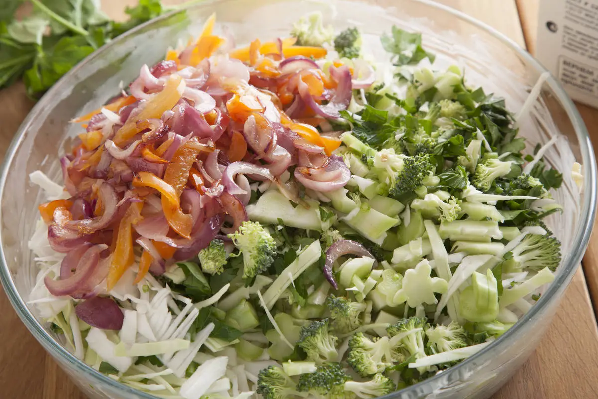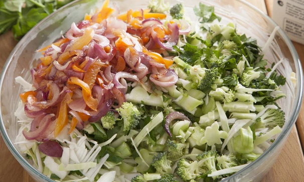 Белокочанную капусту тонко нашинкуйте, брокколи разберите на соцветия, зелень и чеснок порубите.