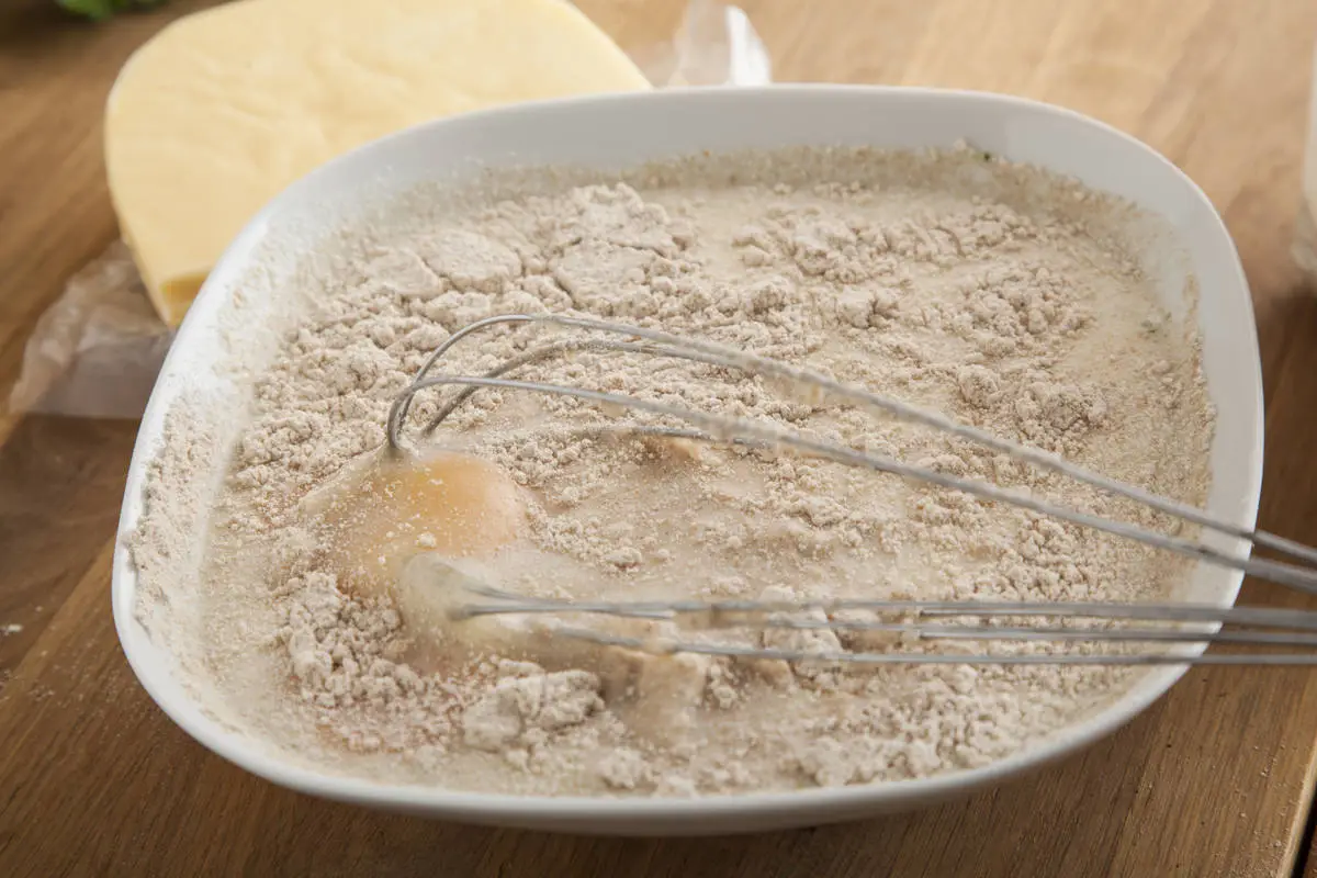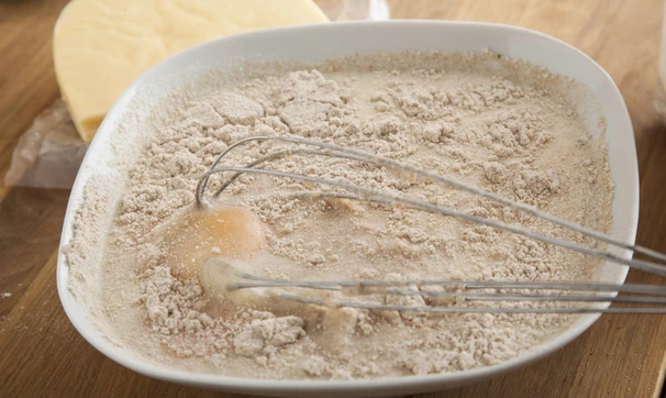 Молоко и яйца взбейте вилкой в пену, добавьте муку,соль и перец.