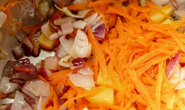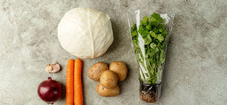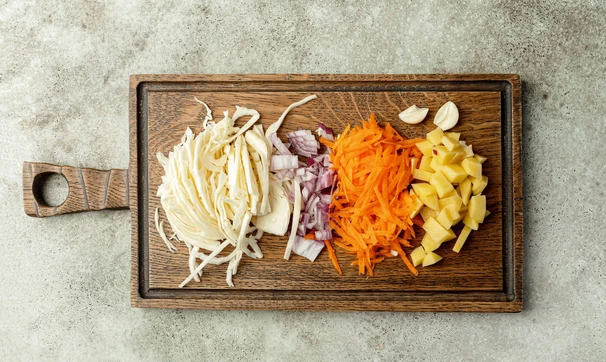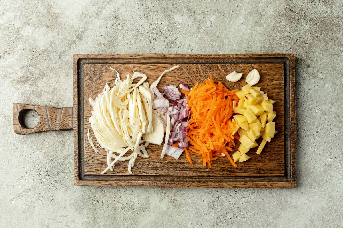 Подготовьте овощи — лук и картофель нарежьте кубиками, морковь измельчите на тёрке, капусту нашинкуйте, зубчик чеснока разрежьте пополам, удалив сердцевинку, затем измельчите.