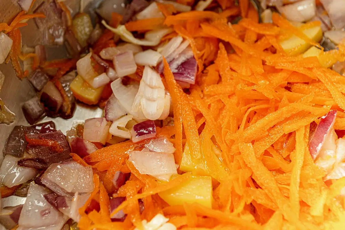 В большой кастрюле обжарьте лук, чеснок и морковь на растительном масле до золотистости.