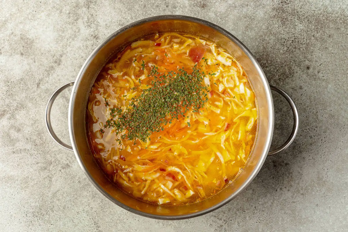 Когда картофель в супе сварится, добавьте нашинкованную капусту и сухую петрушку, варите ещё минут 10-15. Попробуйте и досолите по необходимости. Щи подавайте горячими со сметаной или просто со свежей петрушкой и с чёрным хлебом.