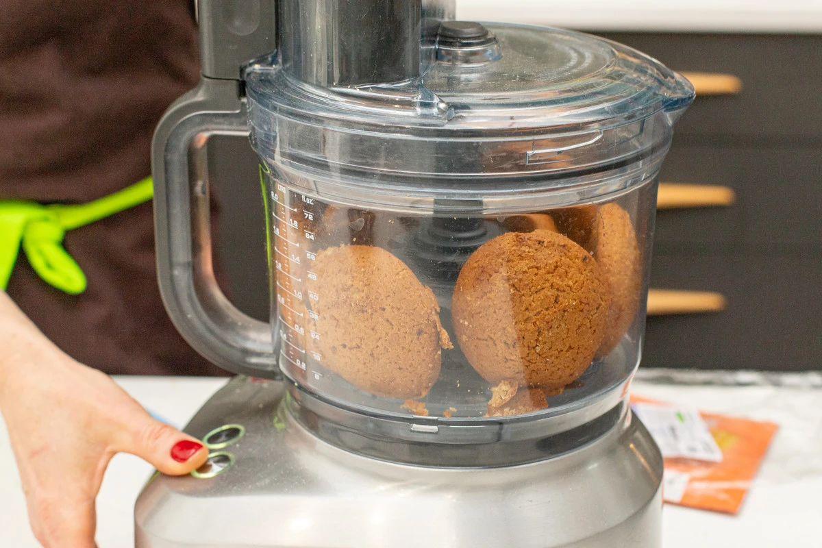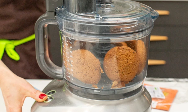 Для основы пробейте овсяное печенье в блендере в крошку. Растопите сливочное масло, влейте к крошке из печенья и сделайте ещё несколько пульсирующих движений блендера.