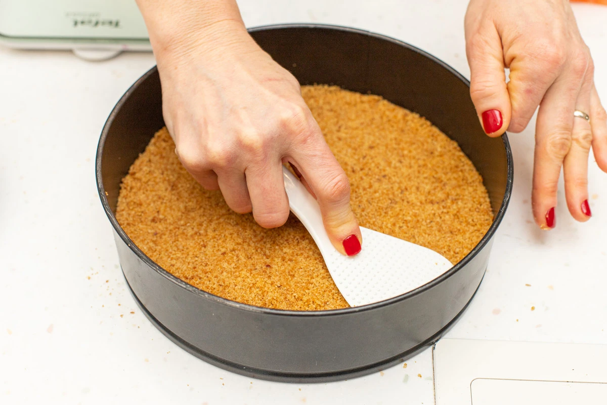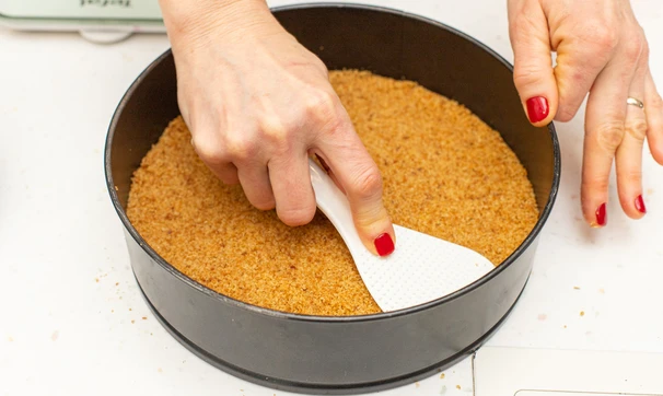 В форму выложите крошку, разровняйте и утрамбуйте, уберите форму в холодильник.