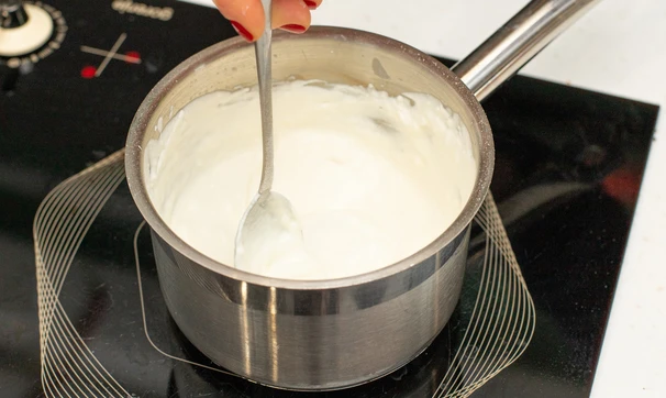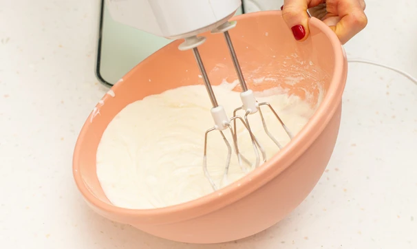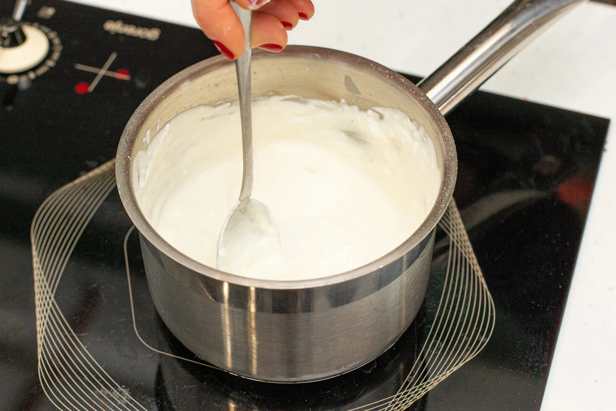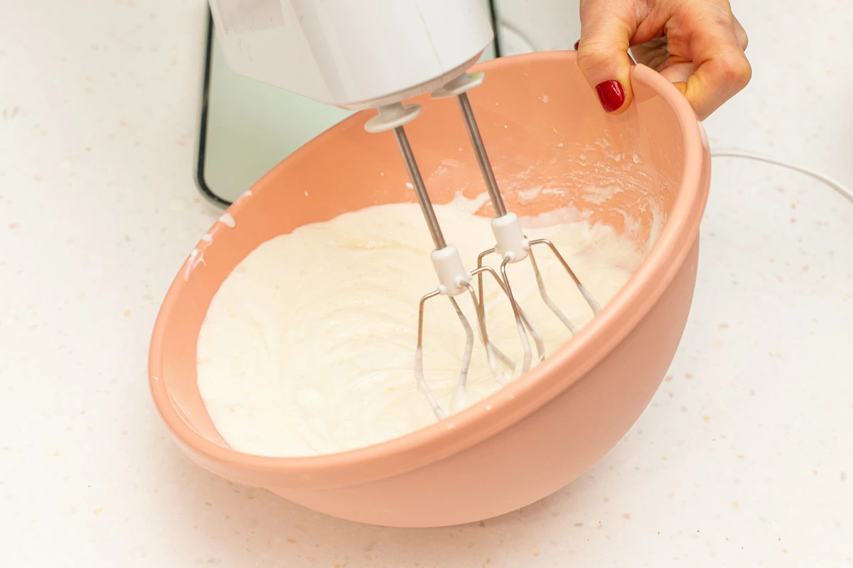 Оставшийся йогурт выложите в миску, добавьте сахарную пудру и перемешайте. Влейте смесь из сотейника и взбейте всё вместе венчиками миксера в пышную массу.