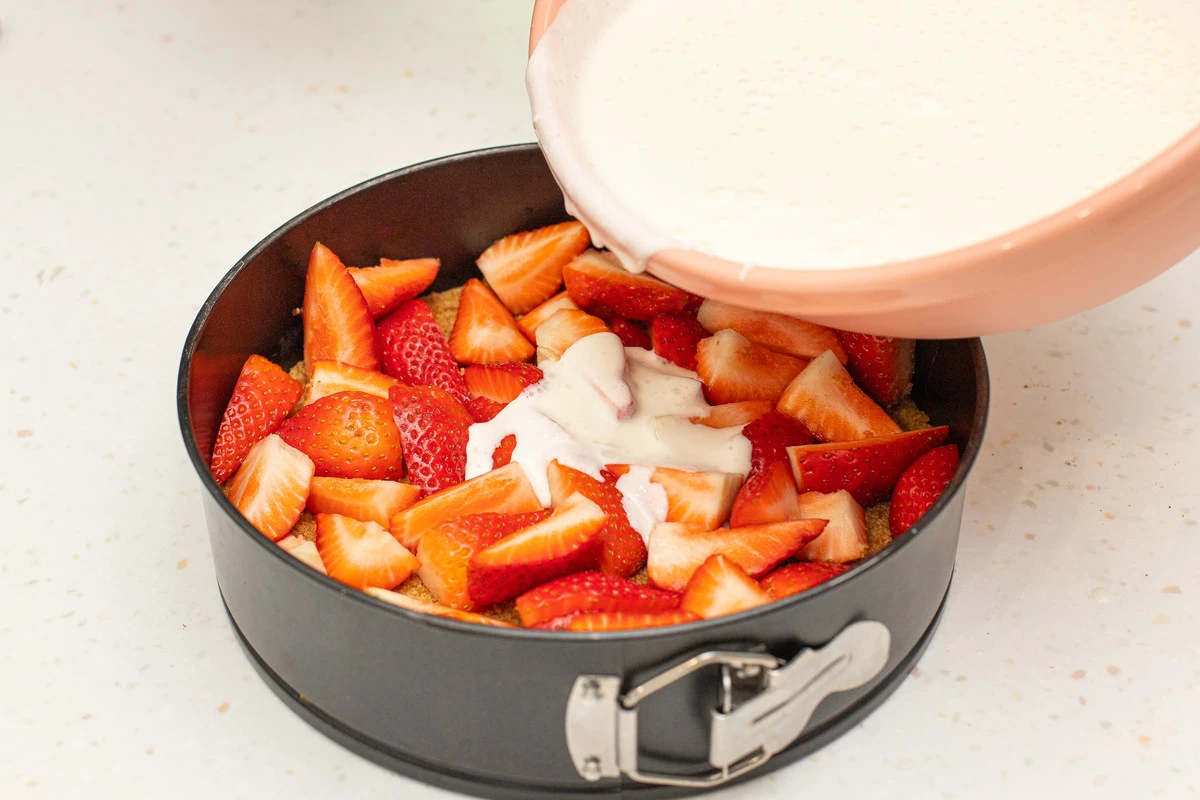 Клубнику нарежьте, часть выложите на основу из печенья, залейте йогуртовой смесью.