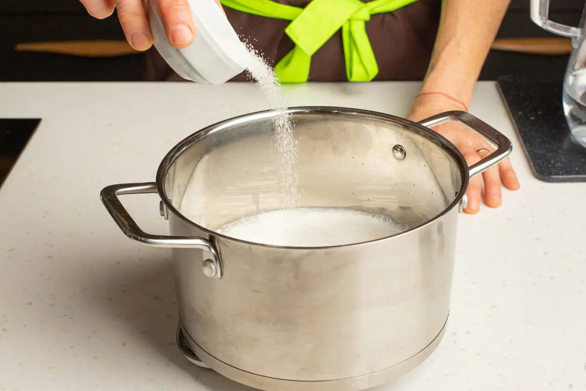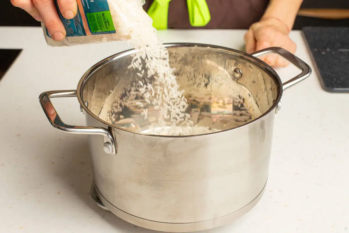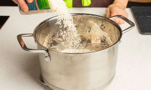 В кастрюльку сложите рис, влейте 250 мл воды и 400 мл кокосового молока.