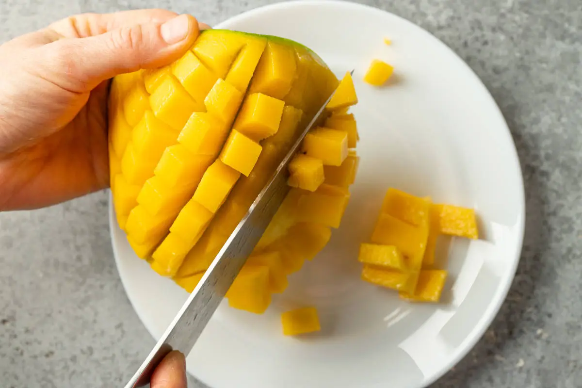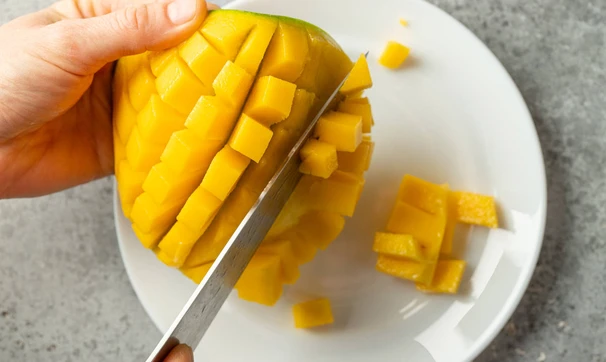 Манго очистите и нарежьте кубиками или дольками.