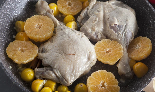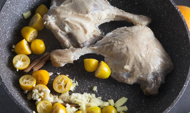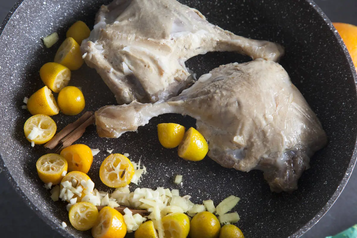 Окорочка выньте из упаковки и выложите на сковороду. Кумкваты тщательно вымойте и разрежьте пополам, чеснок и имбирь очистите и мелко порубите, добавьте к утке.