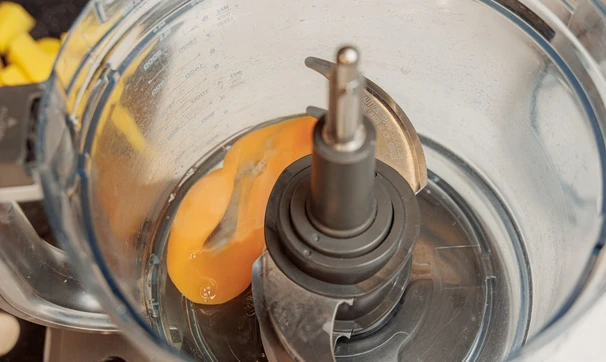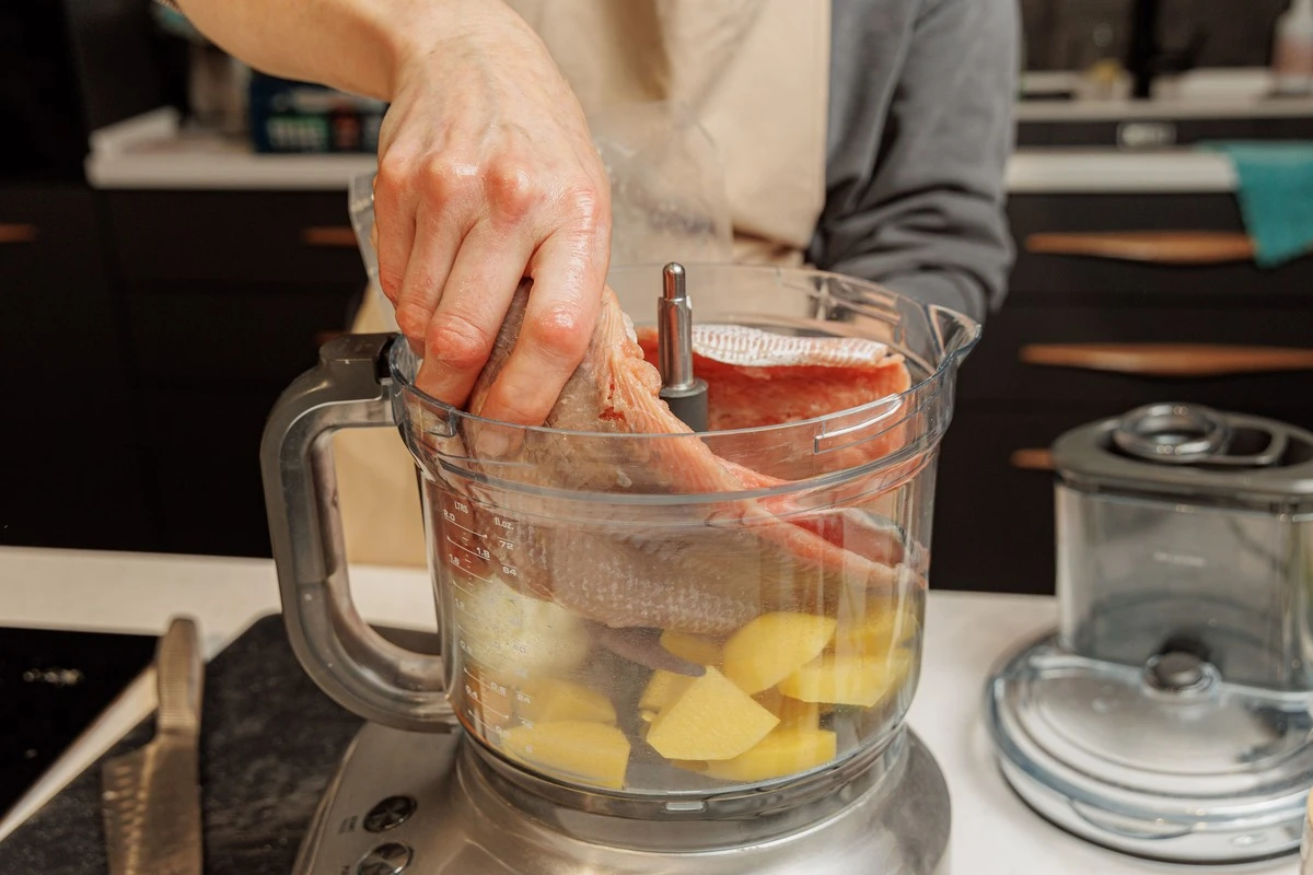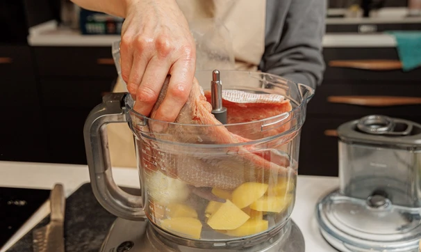 Очистите филе рыбы от костей, если есть. Положите в чашу комбайна. Можно целыми пластинами, можно порезать на кусочки, особенно если у вас не очень мощный комбайн. Измельчите всё вместе до однородности.