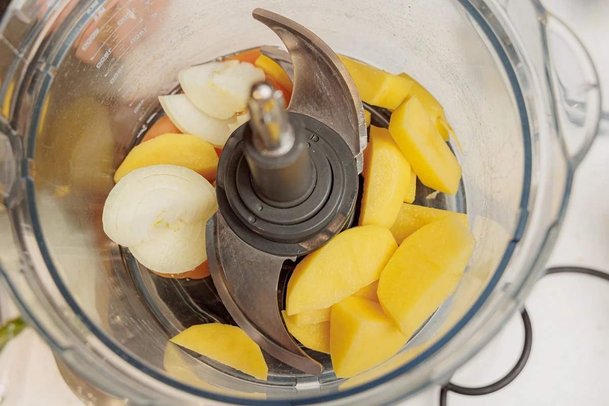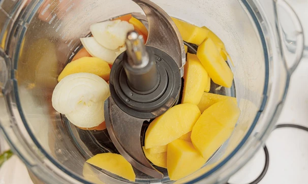 Картофель почистите и нарежьте кусочками среднего размера. Лук почистите, нарежьте полукольцами. Сложите картофель и лук также в комбайн.
