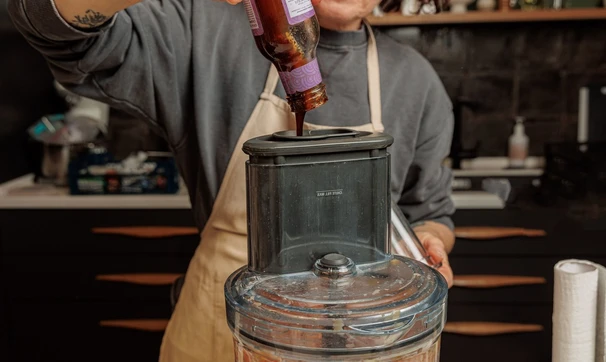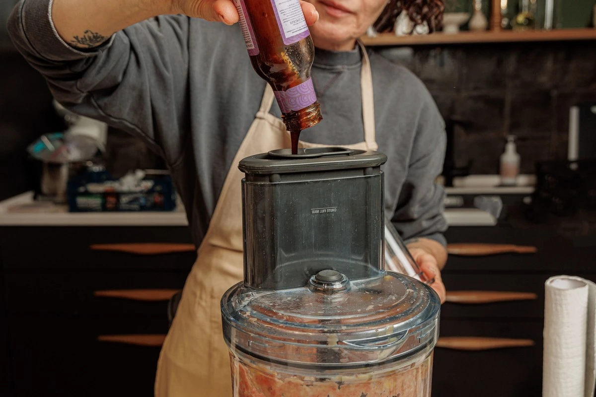 Добавьте соус терияки, чёрный перец, соль и чеснок, снова перемешайте комбайном до однородности.