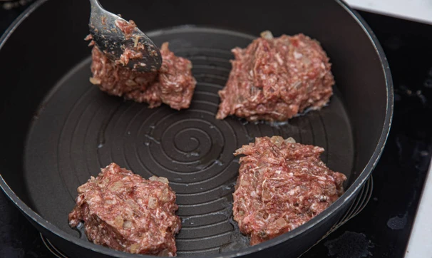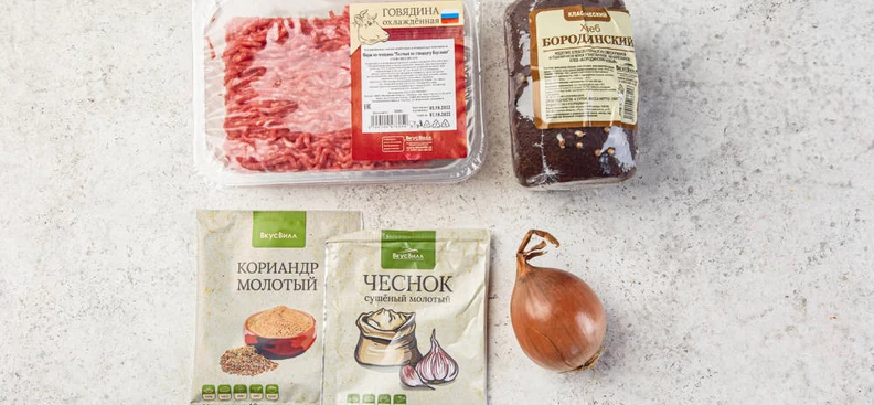По классическому рецепту котлеты из говядины готовятся из говяжьего фарша с добавлением в него лука, хлеба и специй и обжариваются на сковороде. Мы взяли бородинский хлеб, его нежная кислинка хорошо подчёркивает вкус говядины. А из специй рекомендуем использовать кориандр и чеснок — они достаточно яркие и сочетаются с таким фаршем.