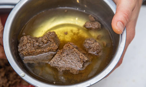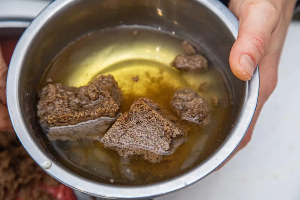 С хлеба срежьте корочки, они нам не понадобятся. Замочите мякиш бородинского на 10 минут в воде. Для говяжьего фарша использование молока при замачивании хлеба излишне, сливочная сладость им ни к чему.