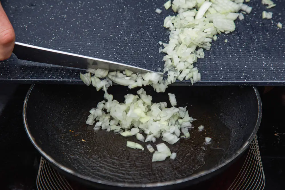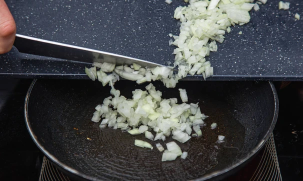 Лук очистите, мелко нарежьте и обжарьте на растительном масле. Следите, чтобы он не подгорел, достаточно лёгкой золотистости. К тому же лук должен сохранить свою сочность, которую отдаст фаршу.