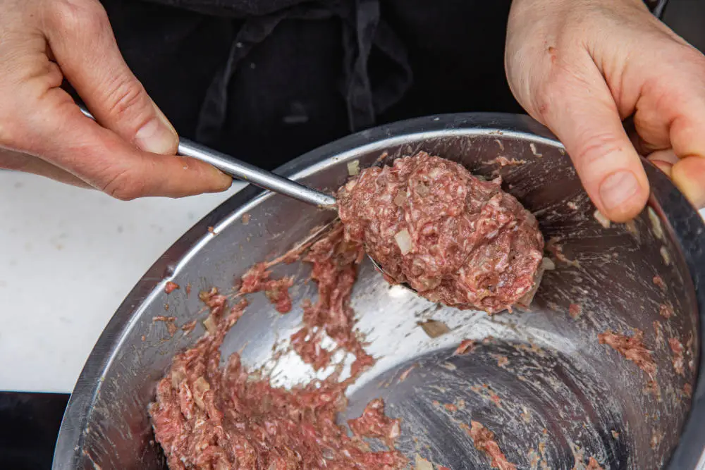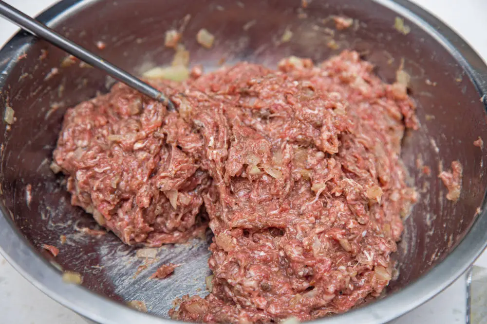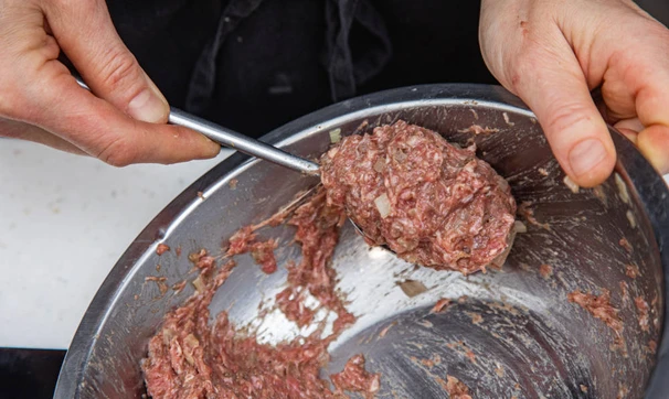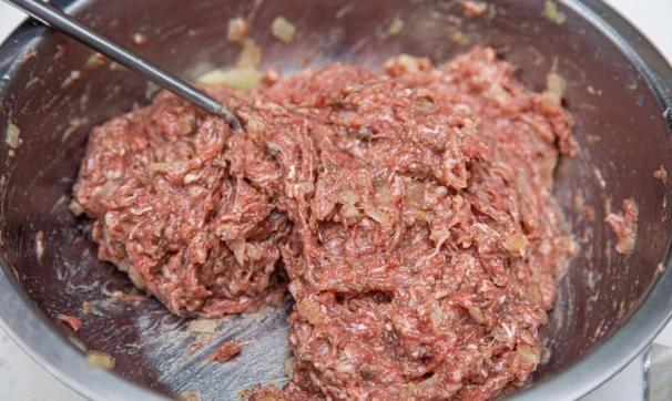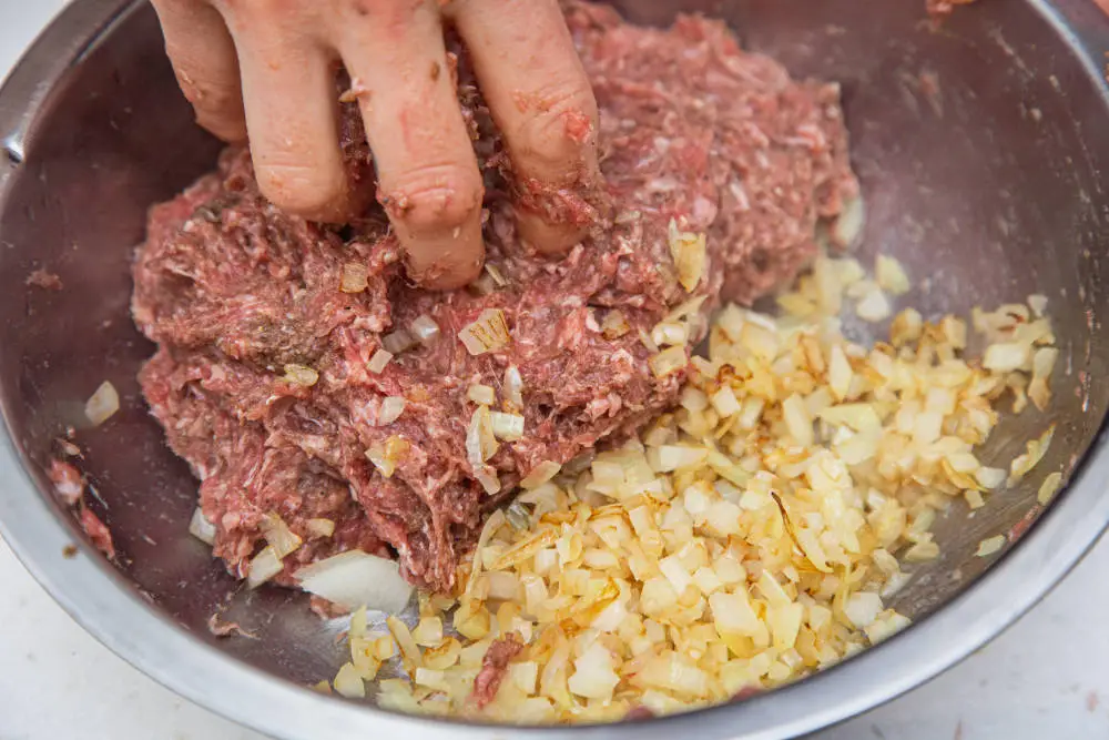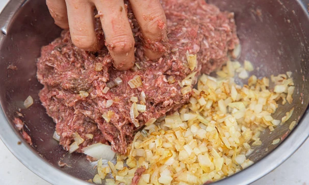 Хорошенько вымешайте фарш руками.