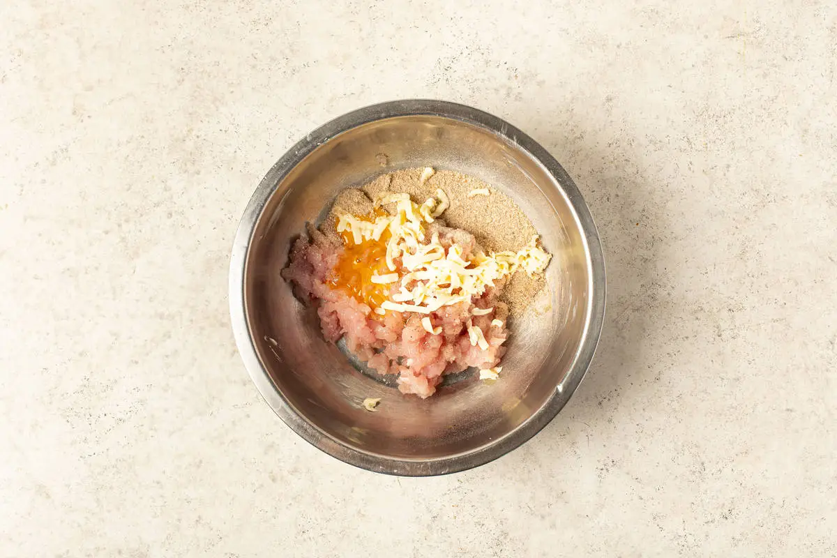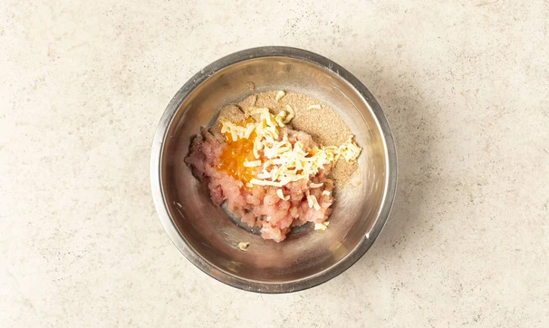 Сложите рубленый фарш в миску, посолите, поперчите. Добавьте тёртое холодное сливочное масло, яйца и примерно 50 г панировочных сухарей. Тщательно перемешайте фарш.