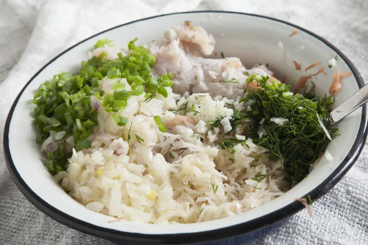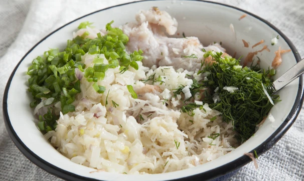 Соедините рыбный фарш, картофель, жареный лук, выдавите чеснок, добавьте мелко порезанные перья зеленого лука и укроп, посолите, поперчите и хорошо вымесите руками.