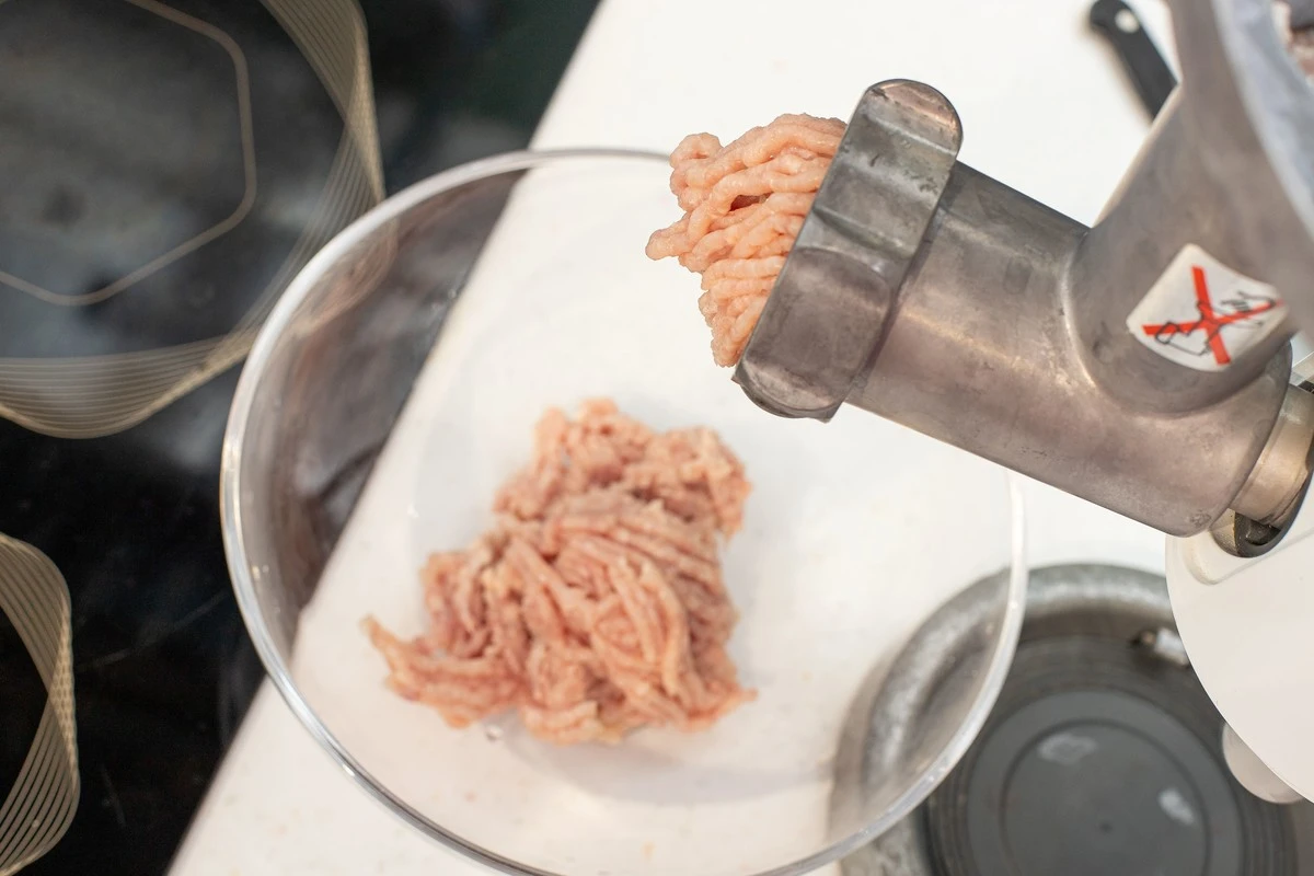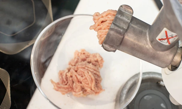 Сливочное масло заранее уберите в морозилку. Нарежьте филе бедра и филе грудки цыплёнка на кусочки и прокрутите через мясорубку.