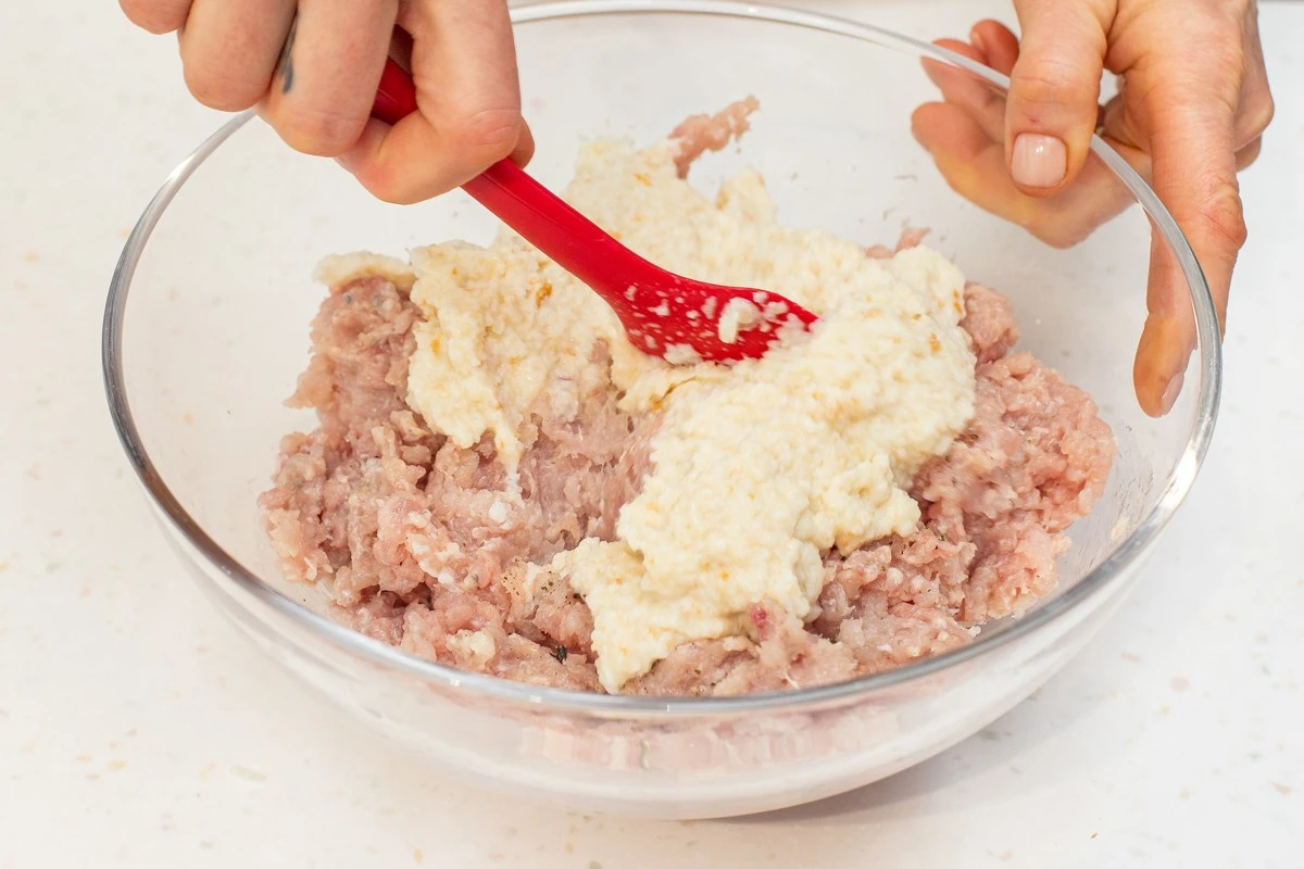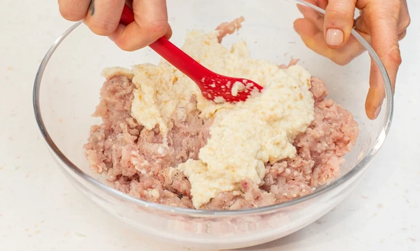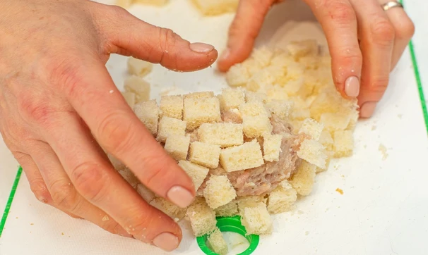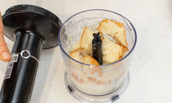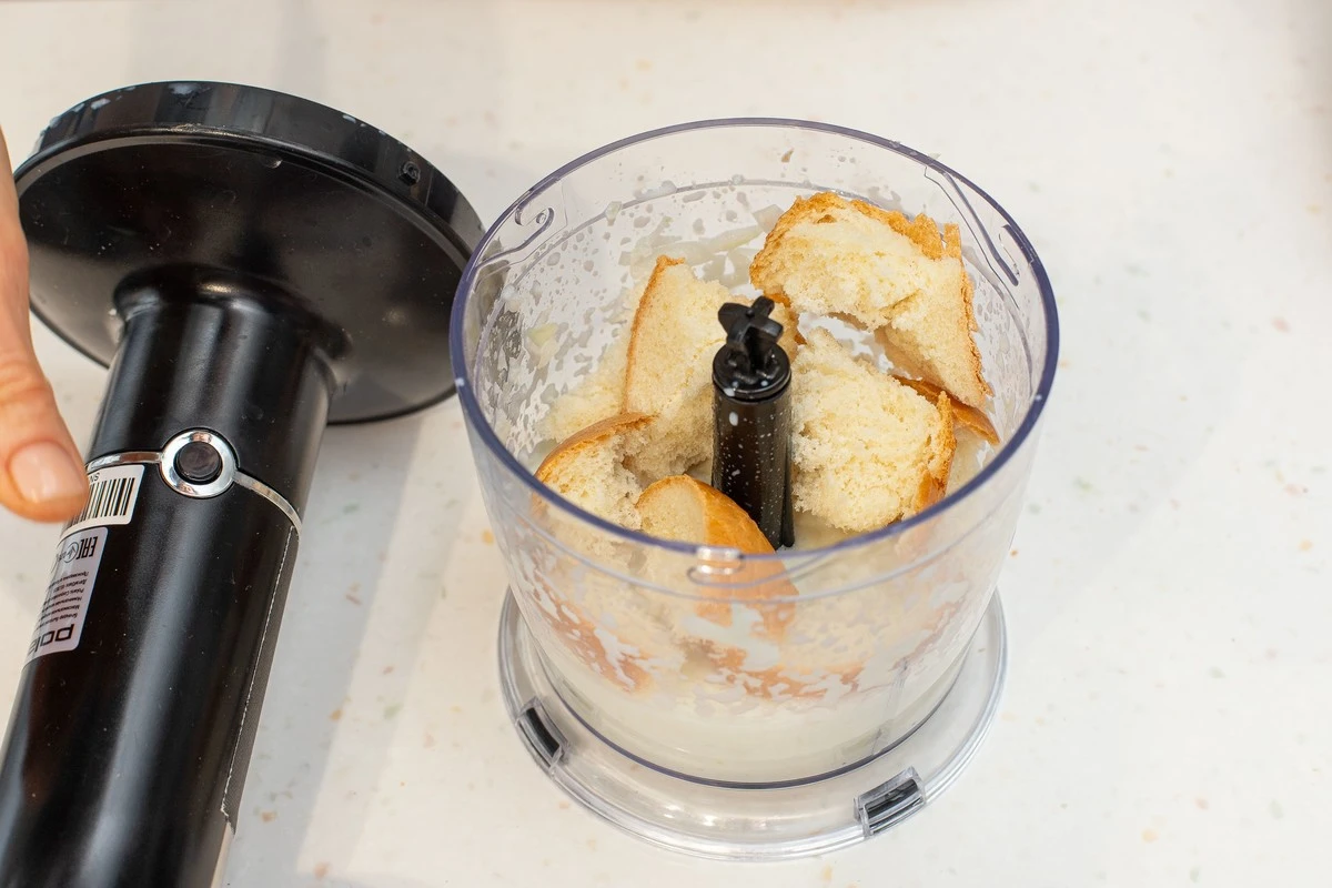 Луковицу почистите, крупно нарежьте и измельчите блендером. Добавьте молоко и 2 кусочка хлеба и измельчите всё вместе. Оставшийся хлеб уберите в морозилку на час.