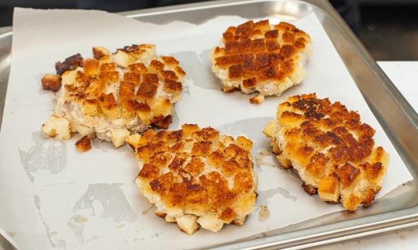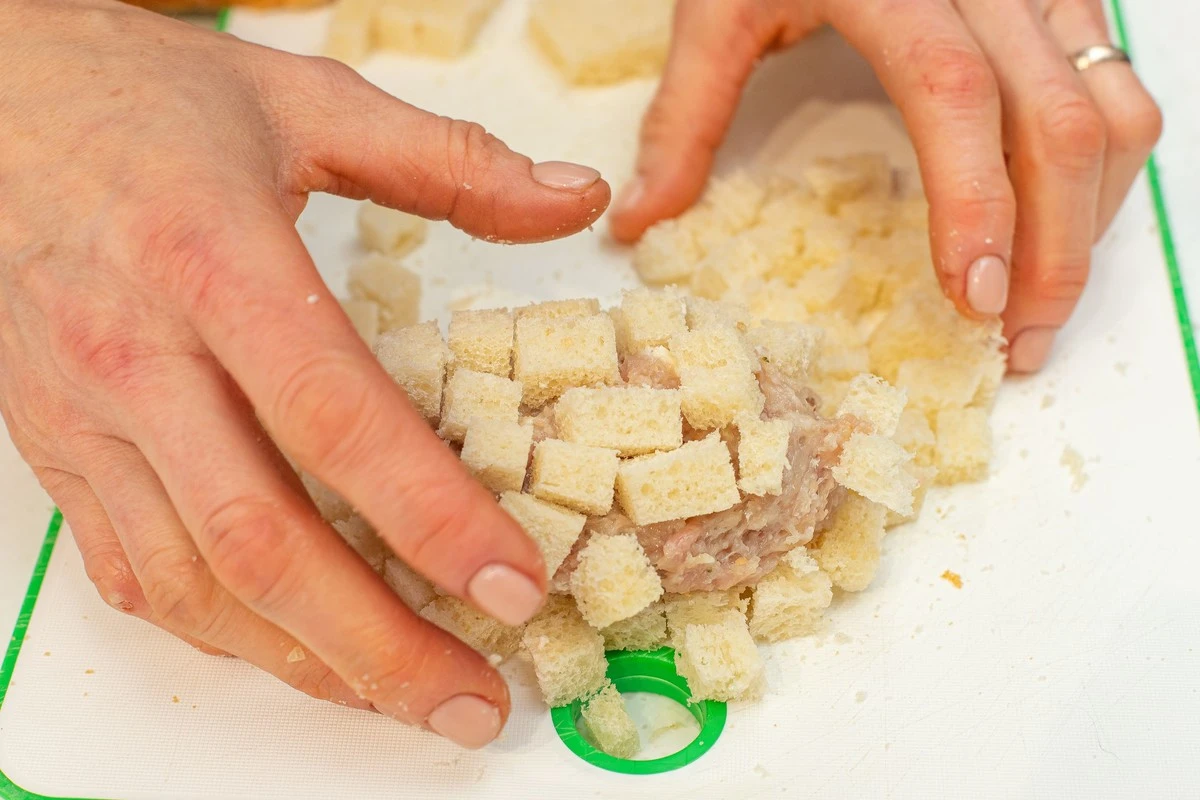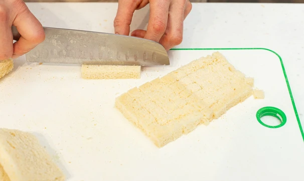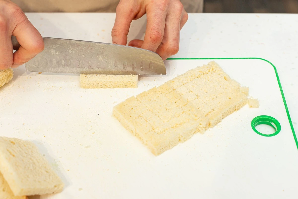 Достаньте подмороженный хлеб из морозилки и нарежьте кубиками.