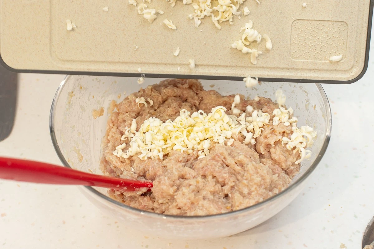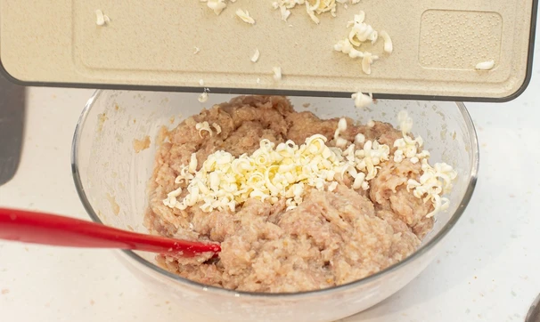 Замороженное сливочное масло натрите на крупной тёрке и добавьте в фарш. Перемешайте.