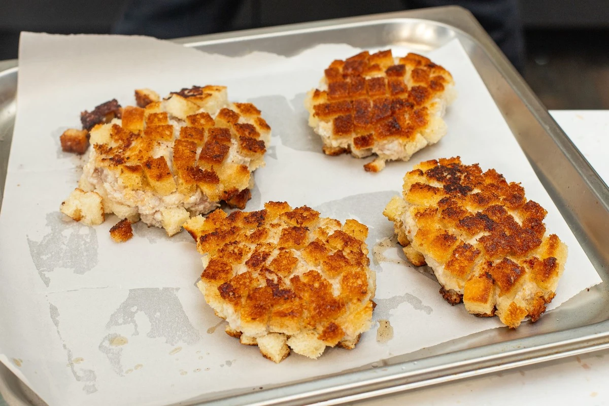 Выложите на часть хлебных кубиков 1 ст. л. фарша и сформируйте котлеты, обваленные в хлебе. На сковороду налейте 1 ст. л. растительного масла и положите 1 ст. л. сливочного, растопите и перемешайте. Обжаривайте котлеты на масле на сковороде примерно по 4 минуты с каждой стороны.
