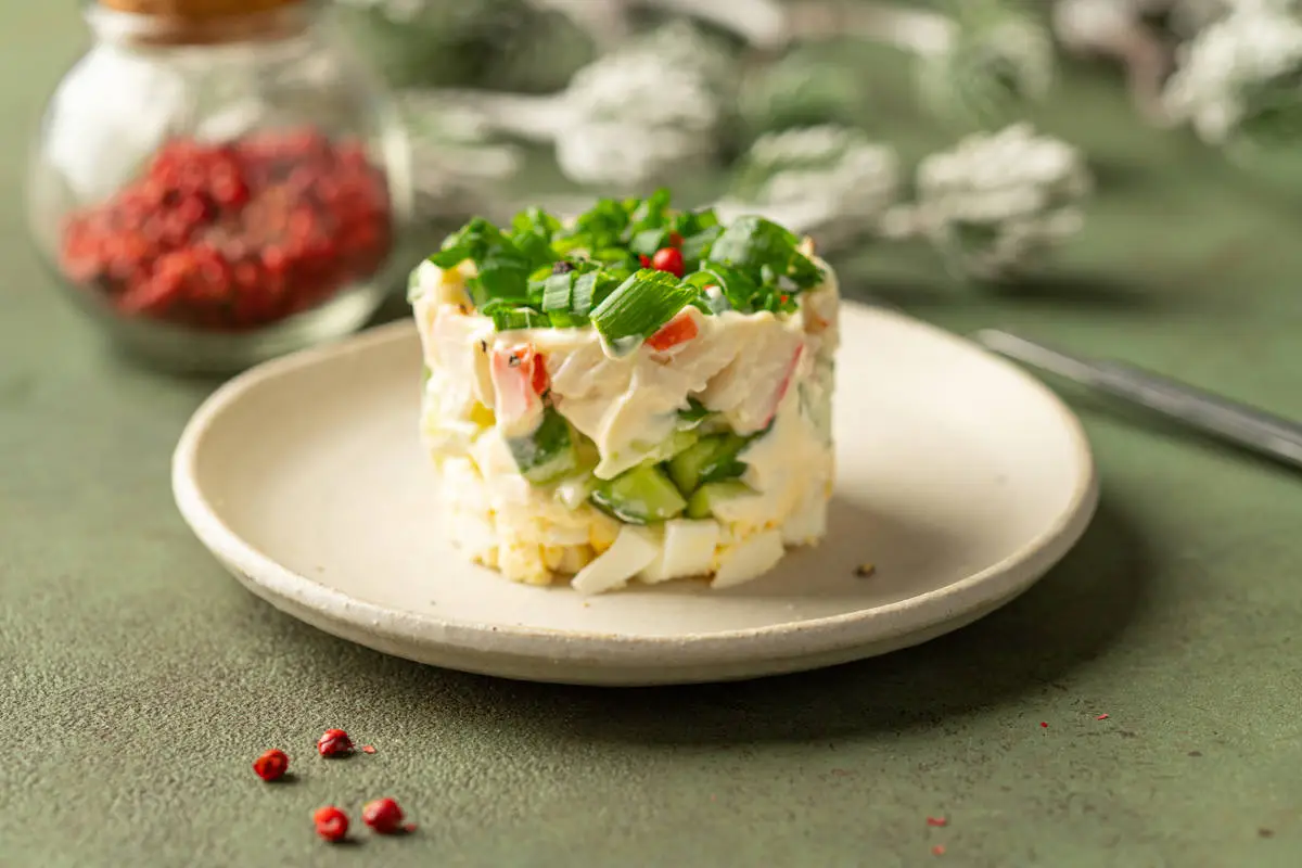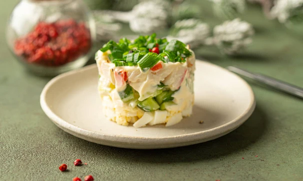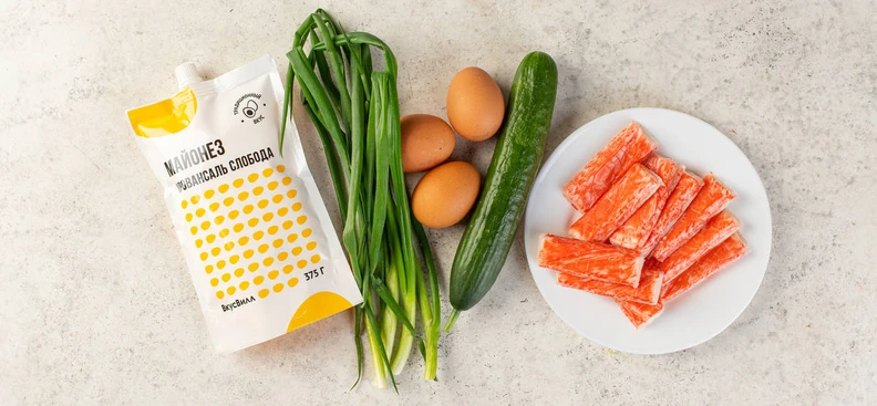 Существует много разных вариантов крабового салата. Мы решили приготовить один из самых популярных — с крабовыми палочками и свежим огурцом. Такой крабовый салат лучше выкладывать слоями.