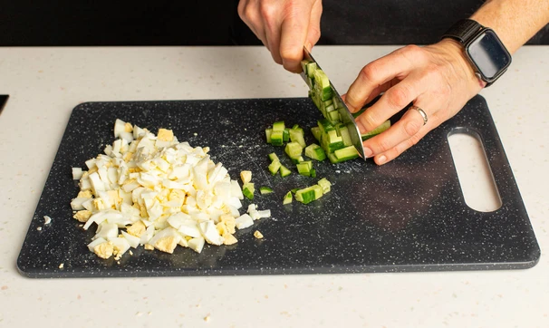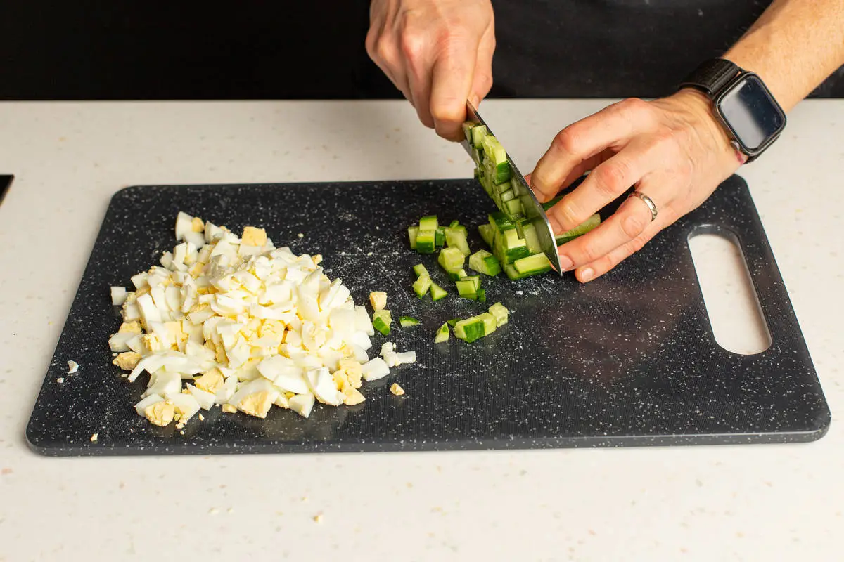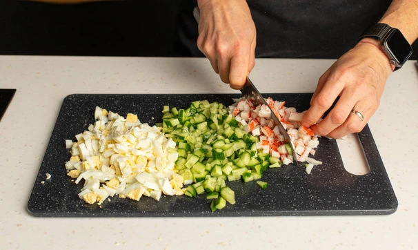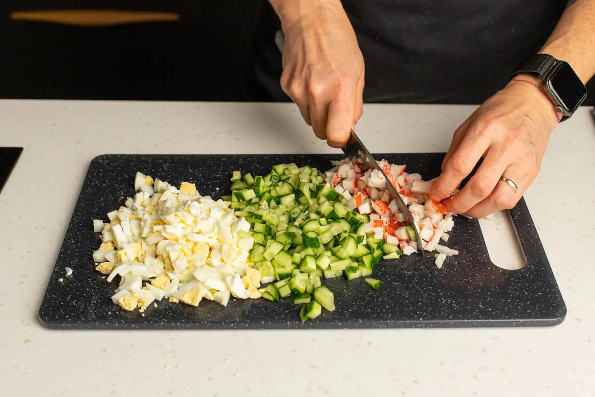 Крабовые палочки, яйца и огурцы нарежьте мелкими кубиками. Можно также измельчить всё на тёрке, если вам так больше нравится.