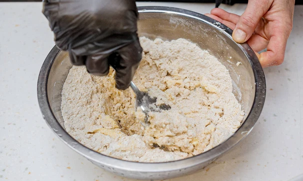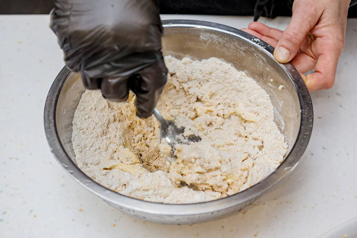Мягкое подтаявшее масло (можно растопить в микроволновке) смешайте с двумя видами муки и двумя ложками сахара, перемешайте вилкой в крошку. Уберите в морозилку на 10 минут.